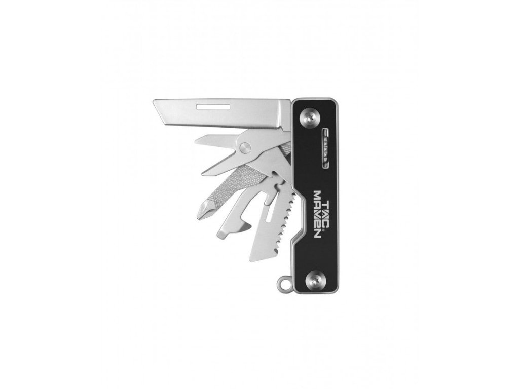 Tento všestranný nástroj, vyrobený s odolnou rukojetí z nerezové oceli a 420 nerezovými komponenty, obsahuje čepel, nůžky, pilku, otvírák na konzervy, otvírák na láhve, pilník na nehty, křížový šroubovák, plochý šroubovák a praktický kroužek na klíče. Kompaktní velikost 8,3 x 1,8 x 2,2 cm a nízká hmotnost 83 g, tento all-in-one nástroj je navržen pro pohodlí a efektivitu v každodenních situacích.