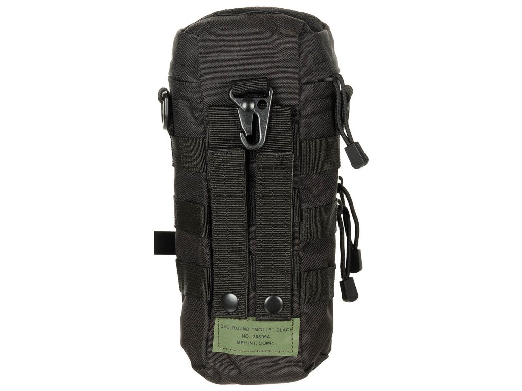 velká hlavní přihrádka s víkem na zip, přední kapsa na zip, velcro pásky, 2 D-kroužky, 1 karabina, průměr: 11 cm, výška: 25 cm, 100% polyester, MOLLE pásky pro snadné uchycení na pásek/batoh