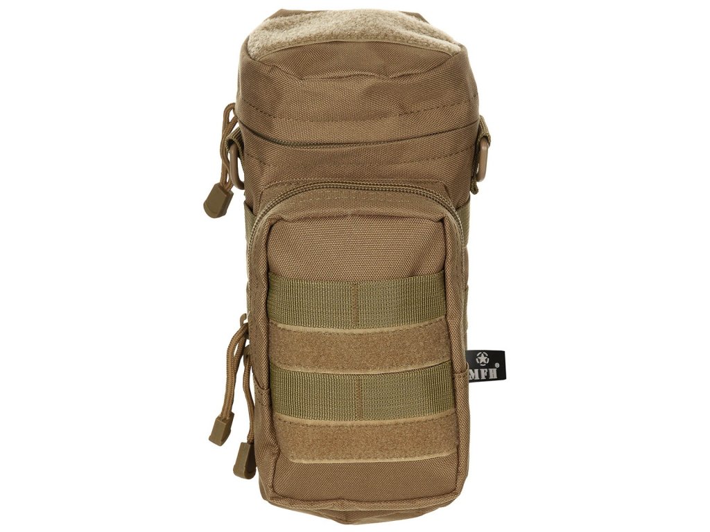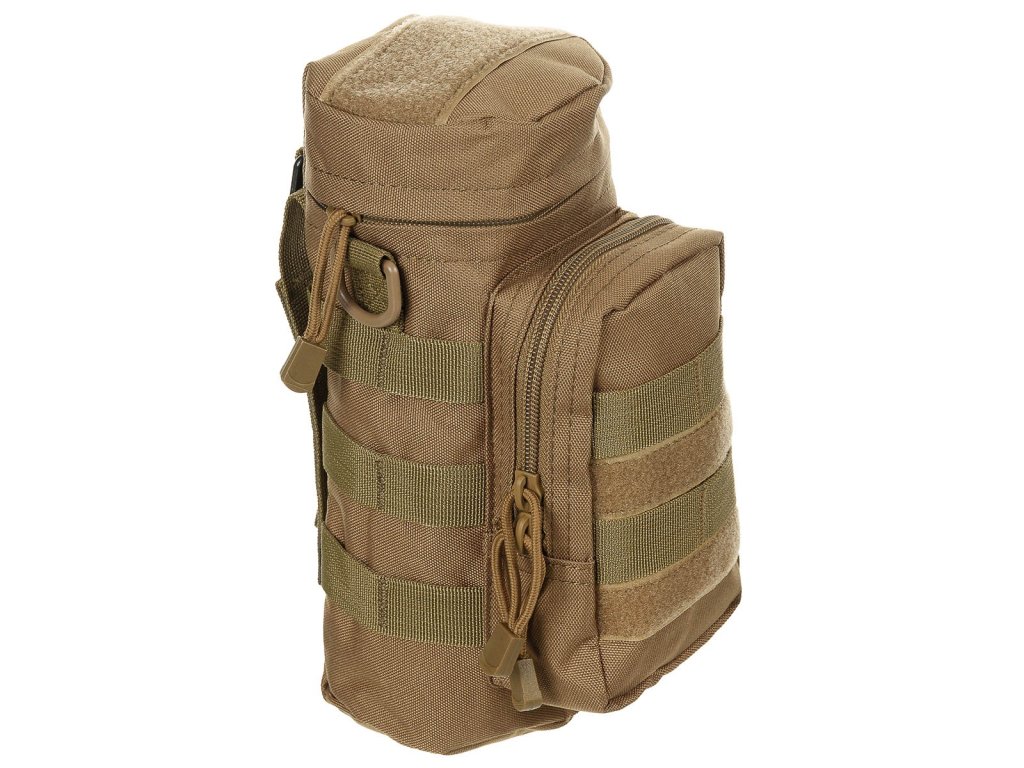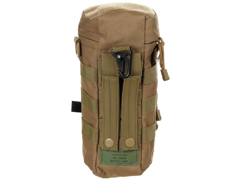 velká hlavní přihrádka s víkem na zip, přední kapsa na zip, velcro pásky, 2 D-kroužky, 1 karabina, průměr: 11 cm, výška: 25 cm, 100% polyester, MOLLE pásky pro snadné uchycení na pásek/batoh