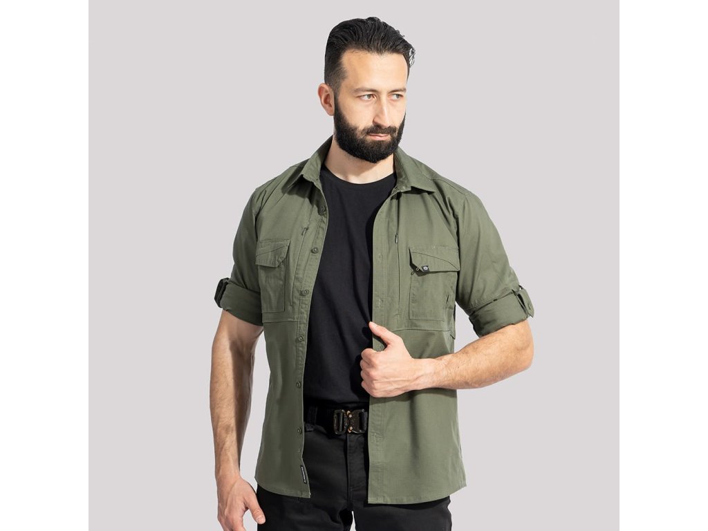 Košile má volný střih, který se dokonale přizpůsobuje pohybům těla nebo taktické vestě. Čtyři praktické kapsy umístěné ve výšce hrudníku zajišťují rychlý a snadný přístup k uloženým předmětům. Dvě hlavní kapsy jsou uzavíratelné na suchý zip a dvě skryté kapsy umístěné za nimi se zavírají na lehký, odolný zip.