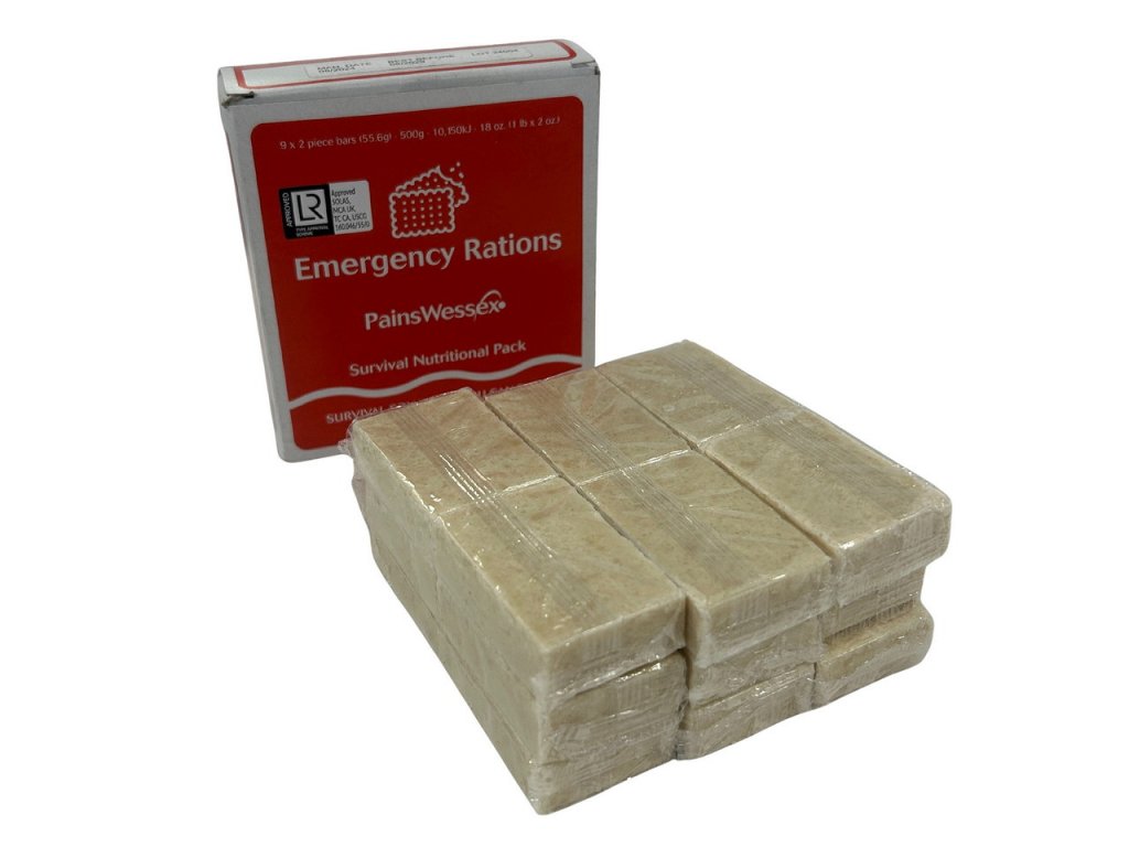 Krabice s potravinami Pains Wessex Survival Ratio splňuje normu ISO18813:2022 a je schválena Lloyd's Register i USCG, čímž splňuje mezinárodní požadavky na potraviny pro přežití. Krabice obsahuje devět tyčinek s vysokou energetickou hodnotou, vakuově balených v hliníkové fólii pro zajištění maximální čerstvosti. Každé balení váží 500 g a poskytuje průměrně 10 150 kJ energie, což je plně v souladu s globálními předpisy. To znamená, že každá tyčinka váží 55,5 gramu a poskytuje 1125 kJ energie. Na 100 gramů to odpovídá 2030 kJ. Obal byl důkladně testován na odolnost a má trvanlivost pět let.